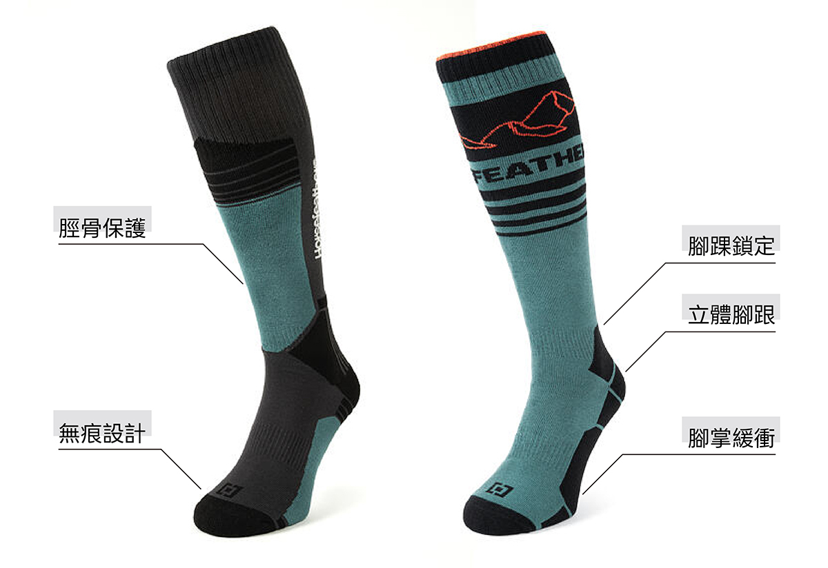 滑雪襪設計上也常加入專屬緩衝區塊,例如小腿前方的「脛骨保護墊」、腳掌前後的「衝擊吸收墊」。因此,缺乏針對滑雪需求設計的登山襪或單車襪,不適合用來替代滑雪襪。