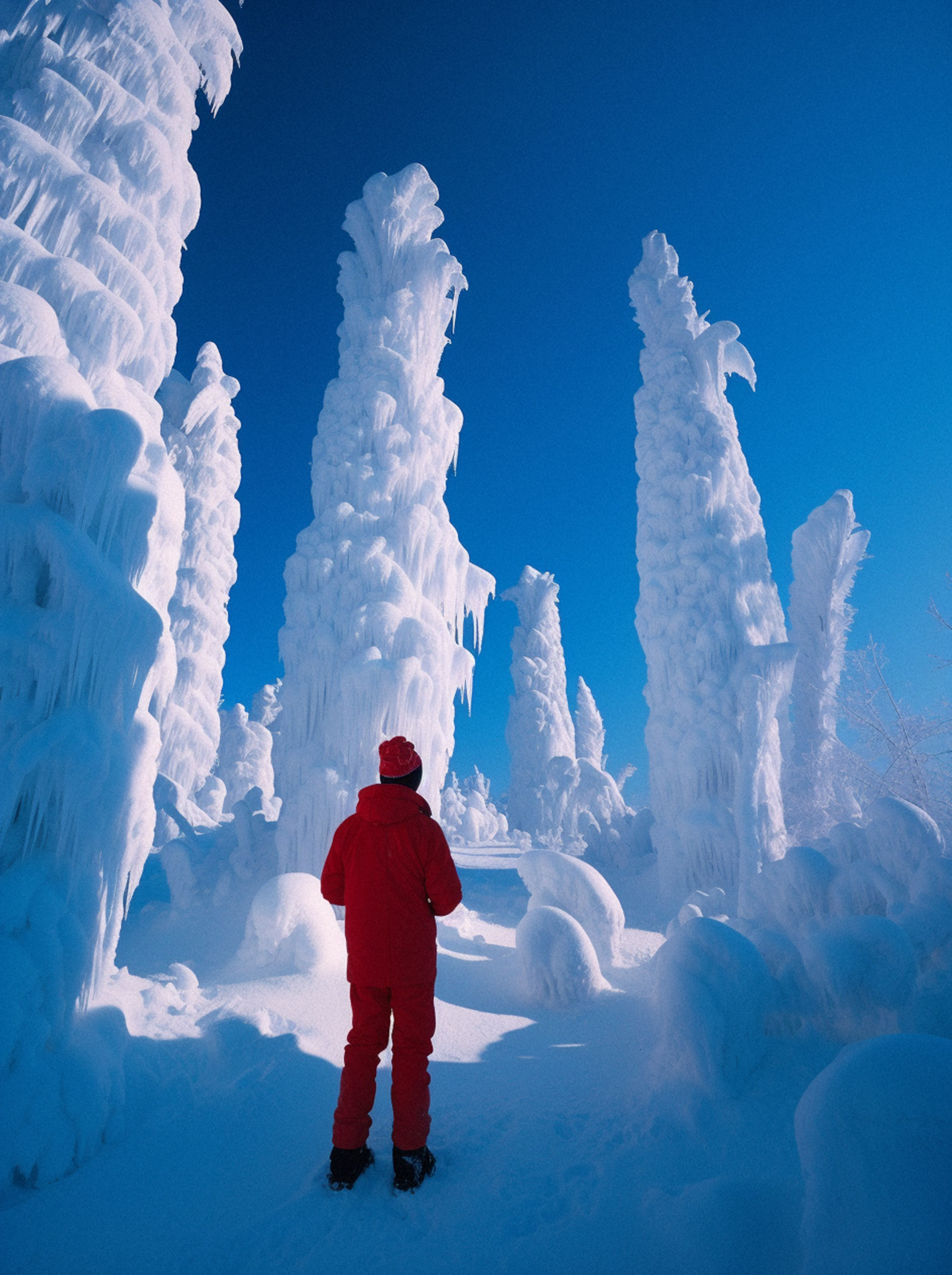 「樹冰」是冰雪附著在樹木表面的一種自然景觀,必須同時符合 4 大條件才能形成,包含冰雪容易附著的針葉樹、持續強風與低溫、低於 0°C 的液態水滴與適量積雪(2~3 公尺)。由於形成條件嚴苛,因此放眼全球皆是相當罕見的自然景觀,其中又以藏王樹冰最為有名,最佳觀賞期是每年 1月下旬至 2 月中旬。有趣的是,樹冰的形狀與大小各異,遠看像是好多隻怪獸,因此又被稱為「雪怪」。