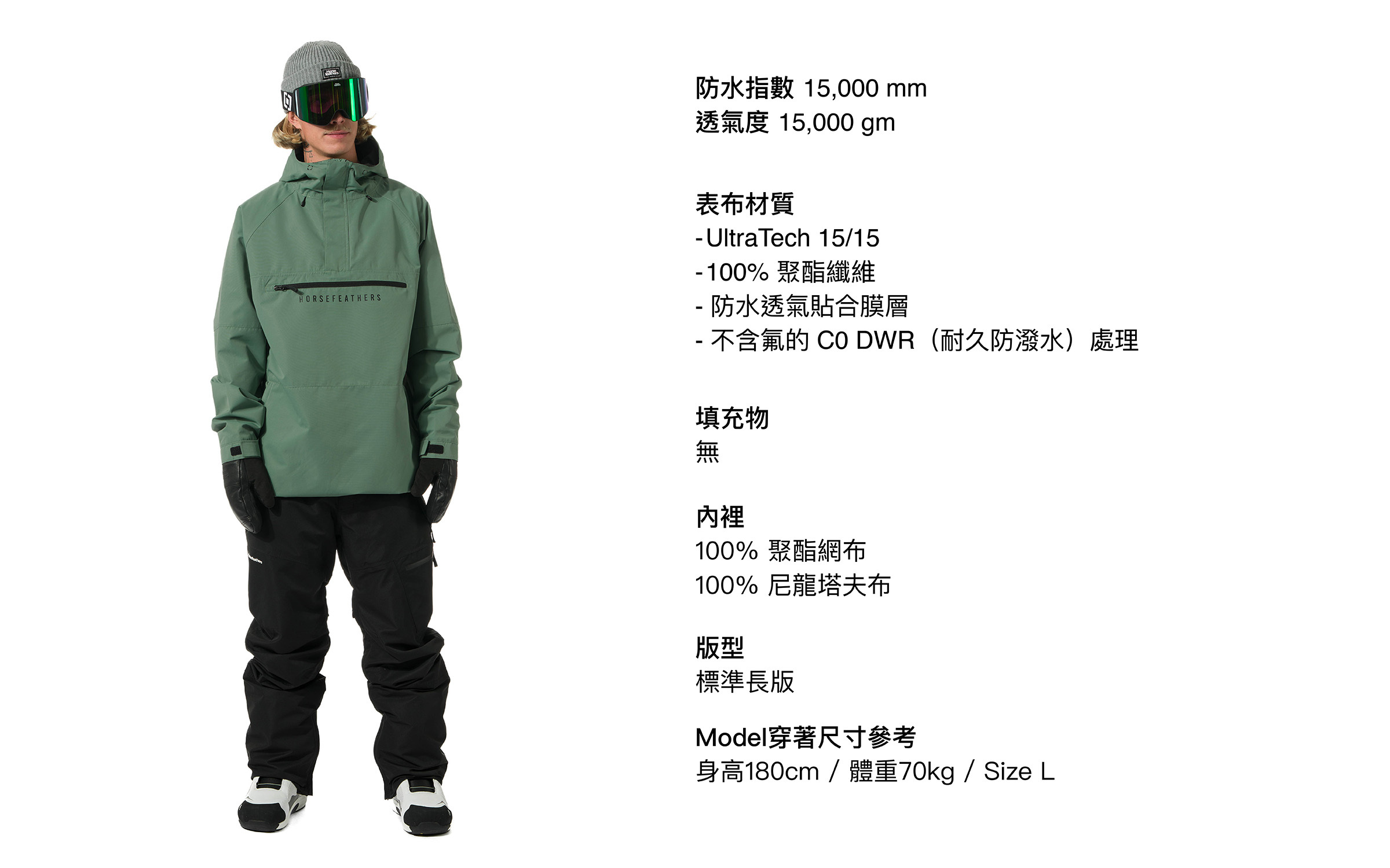ULTRATECH 防水透氣材質:外層使用全防水和透氣的薄膜進行層壓。布料依照bluesign 標準進行製成和生產,以優化永續性。