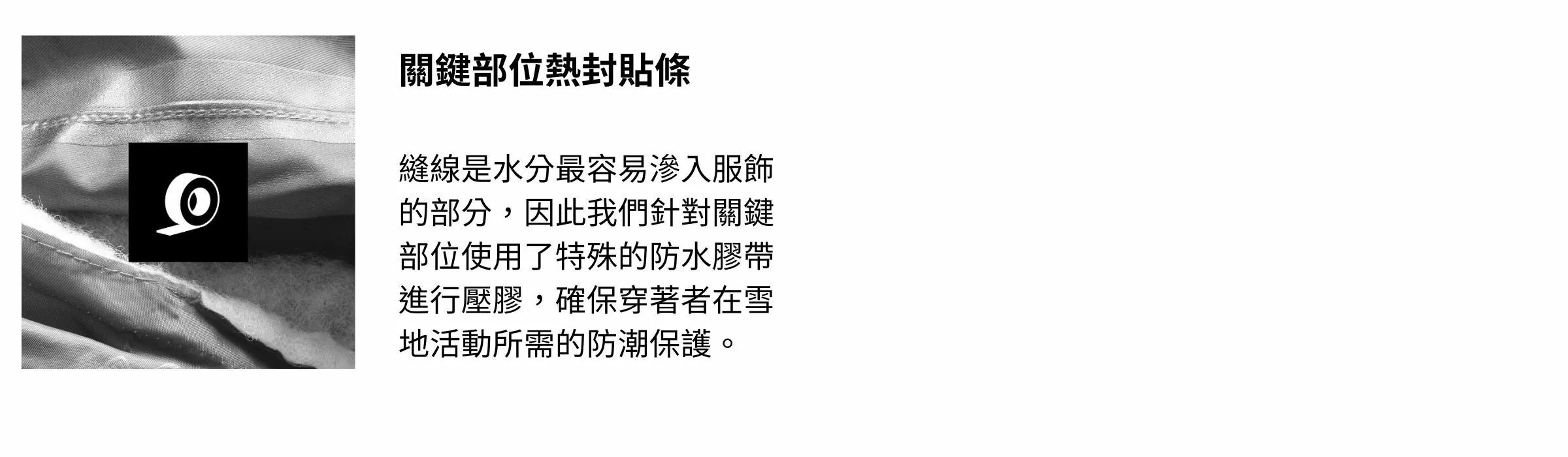 關鍵部位熱封貼條:縫線是水分最容易滲入服飾的部分,因此我們針對關鍵部位使用了特殊的防水膠帶進行壓膠,確保穿著者在雪地活動所需的防潮保護。