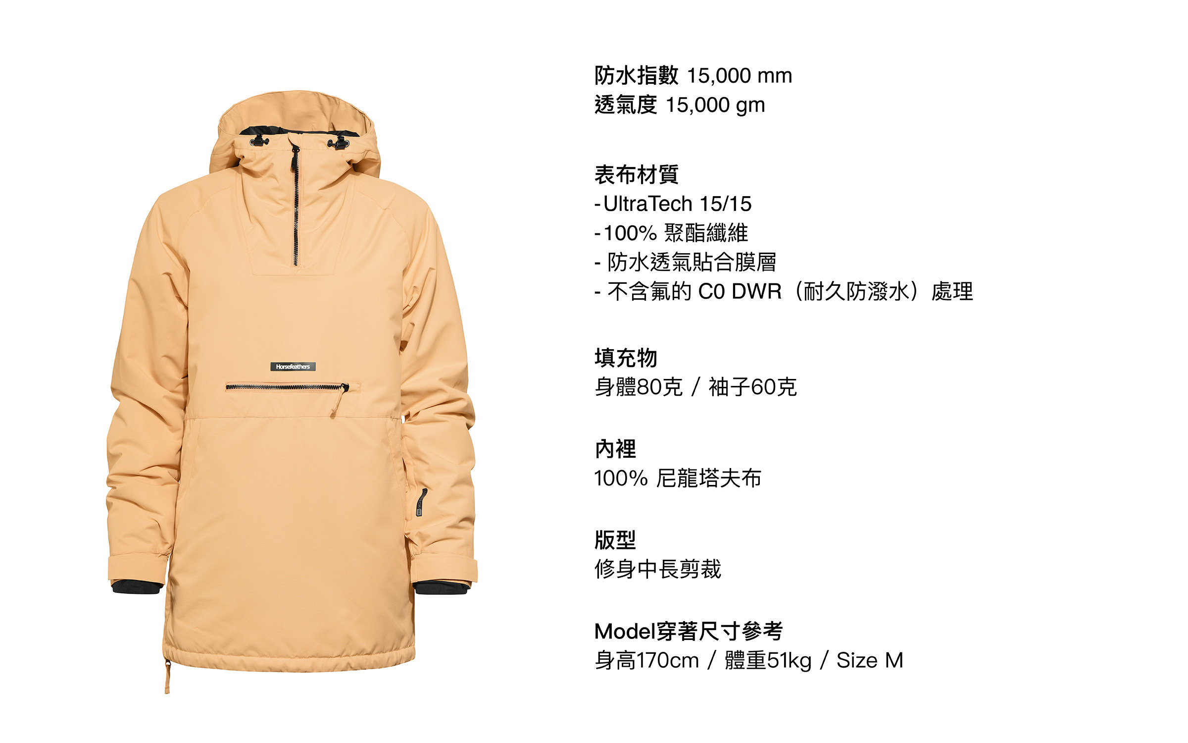• 不含氟的 C0 DWR(耐久防潑水)處理