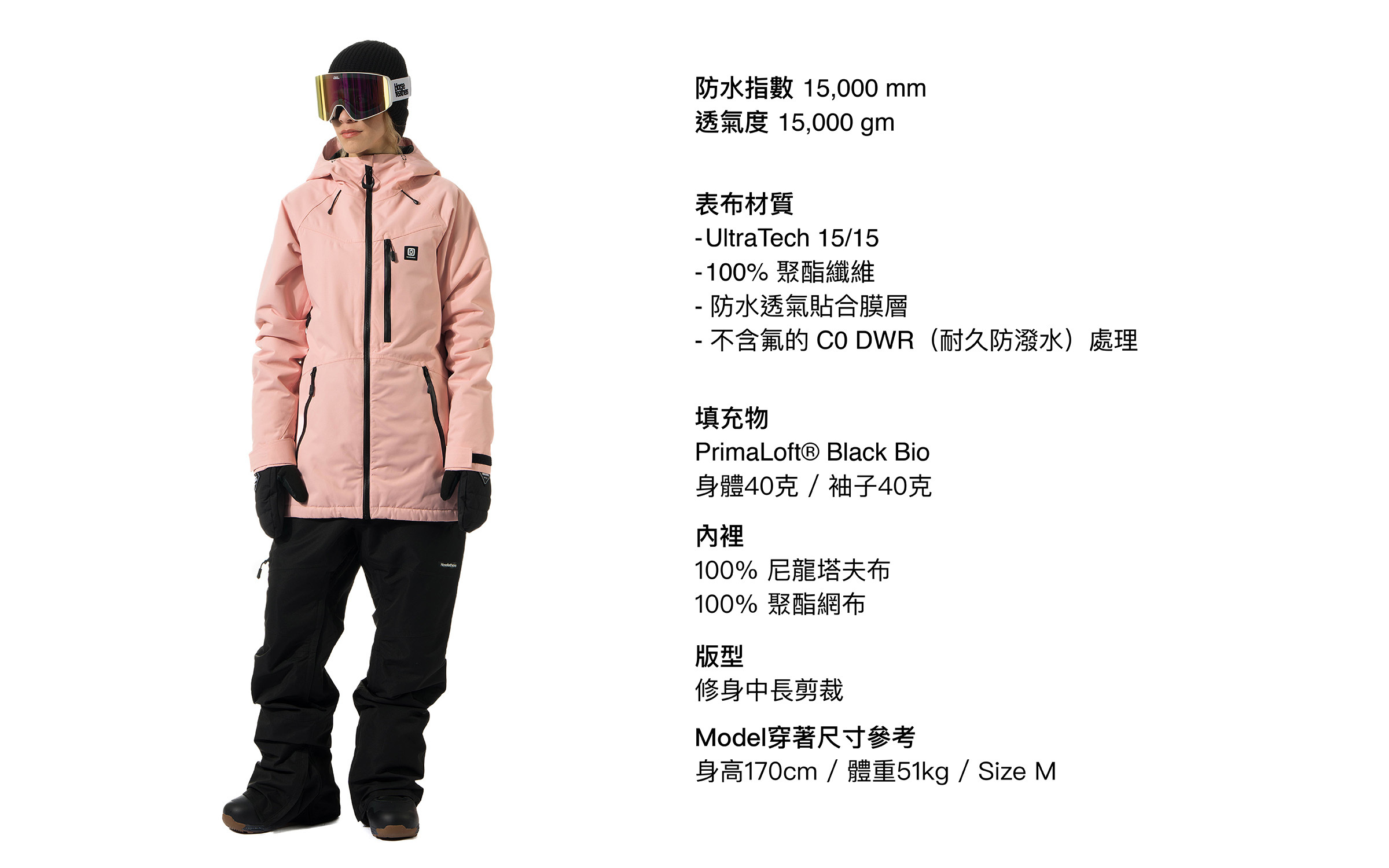 • 不含氟的 C0 DWR(耐久防潑水)處理