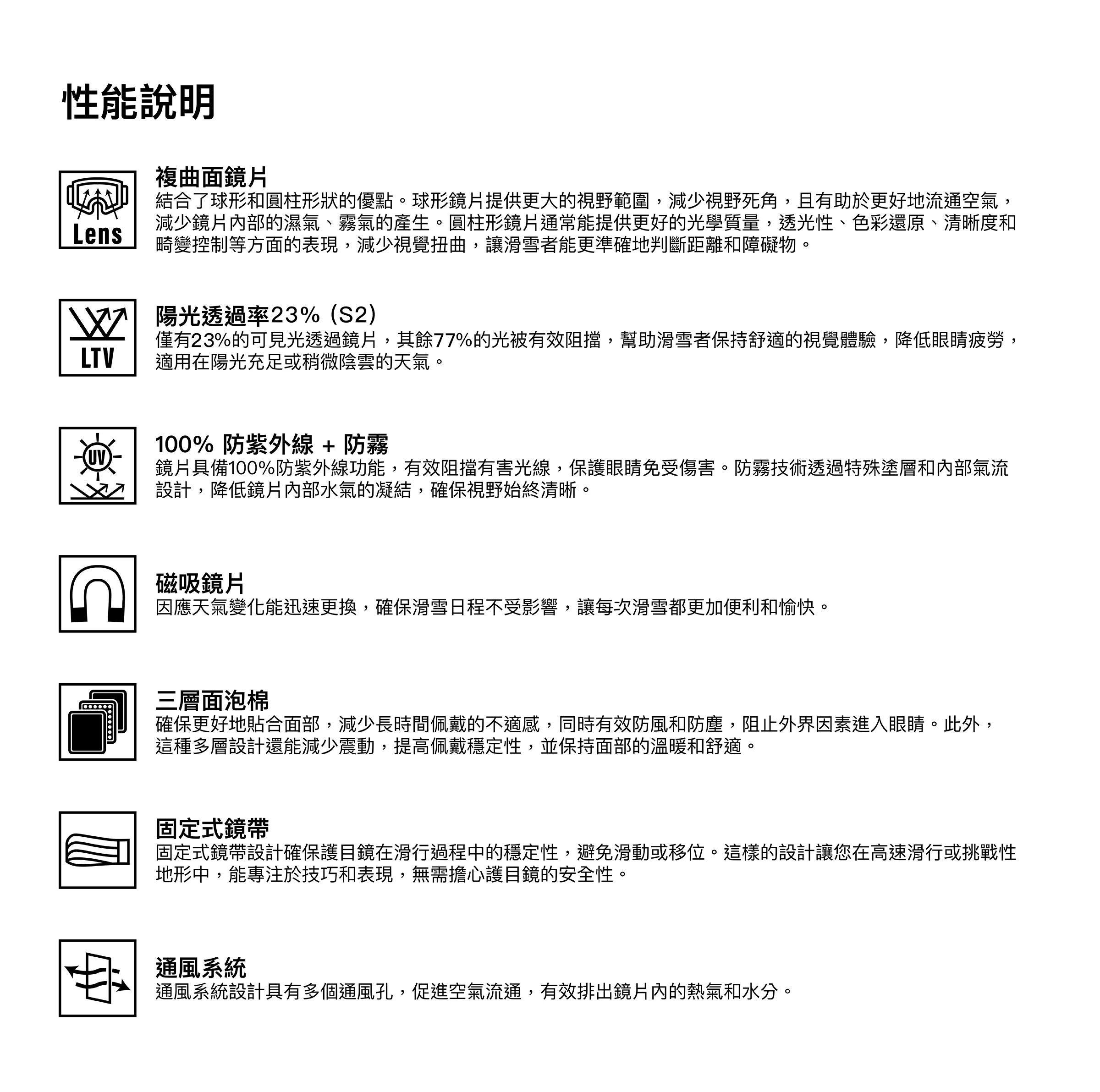 中性款雪鏡_LYNX GOGGLES,採用 圓柱形鏡片設計,搭載 100% 抗UV、防霧塗層 與 專業通風系統,在雪場中為你提供清晰又穩定的視野。內側配置 三層舒適泡棉 與 固定式彈性鏡帶,長時間配戴依然貼合穩定。更搭載 磁吸式鏡片設計,讓更換鏡片快速便利,隨時應對不同光線條件。