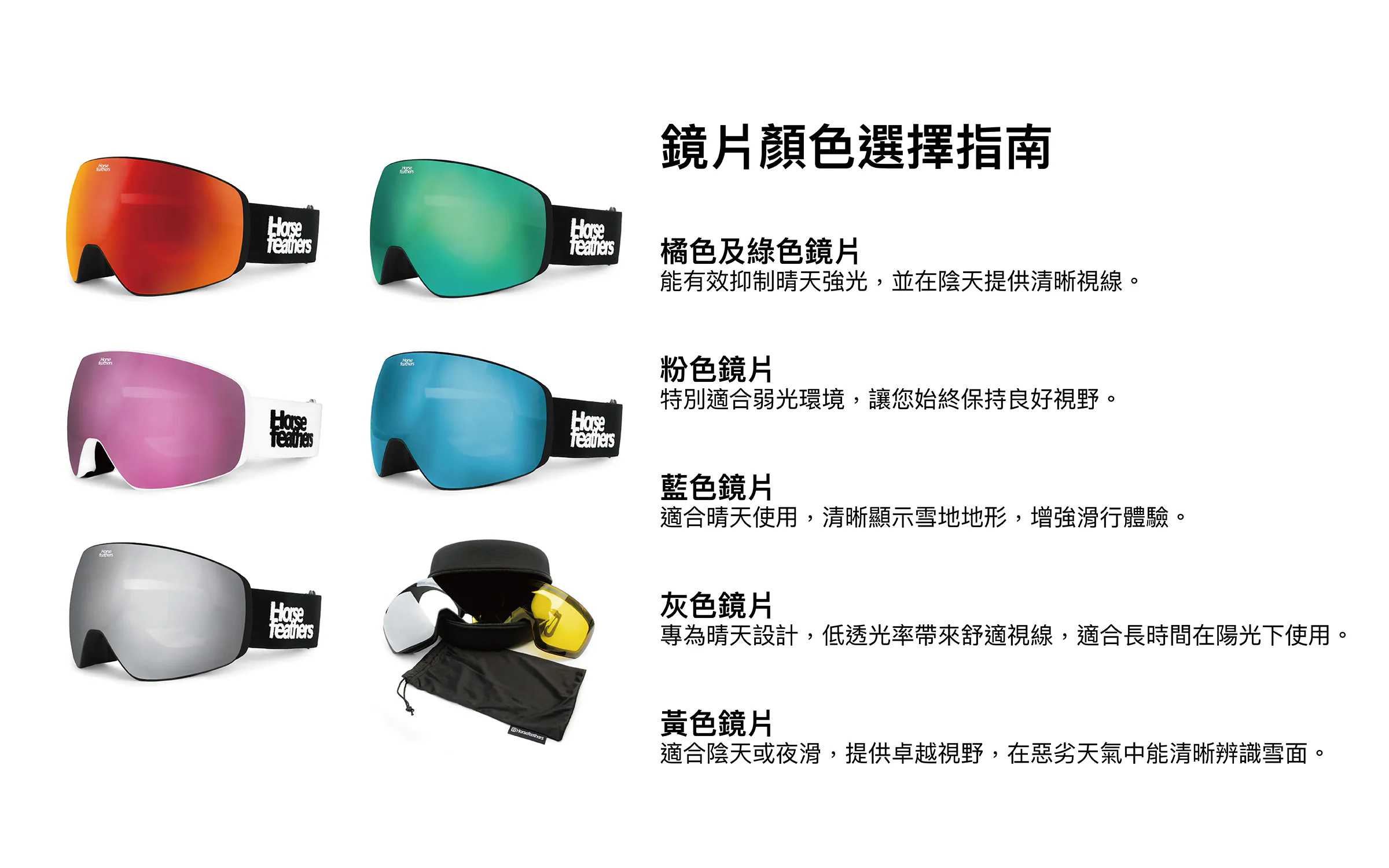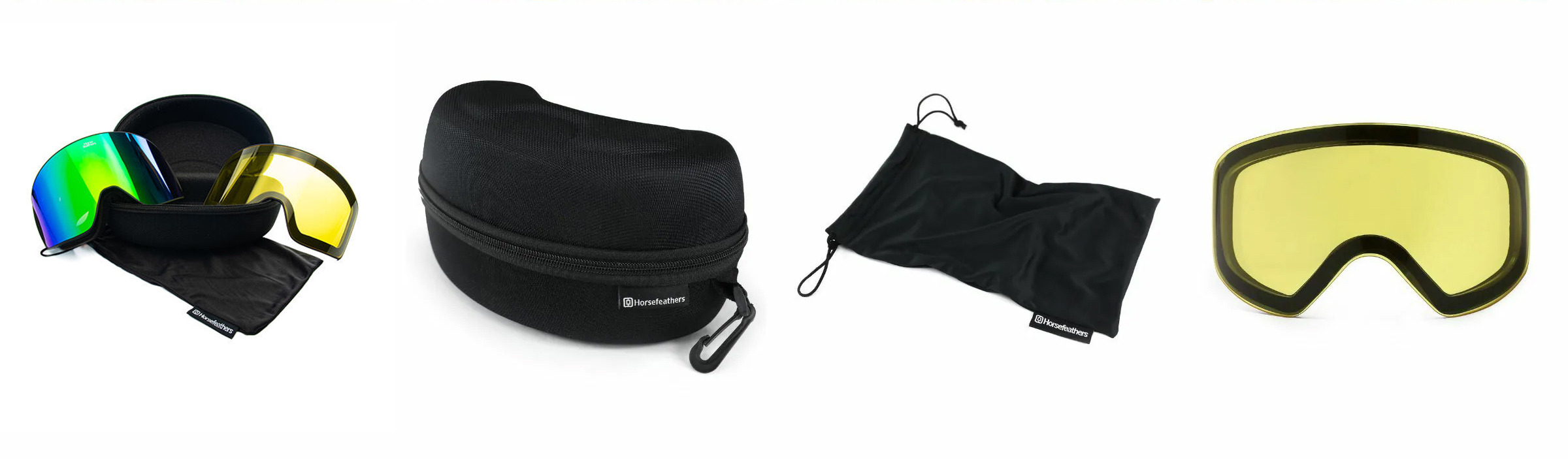 隨附黃色低光鏡片(VLT 82%,S0 類別),在陰天或夜間滑行時依然保持良好視野。另附 拉鍊硬殼盒與布袋,方便收納與攜帶。