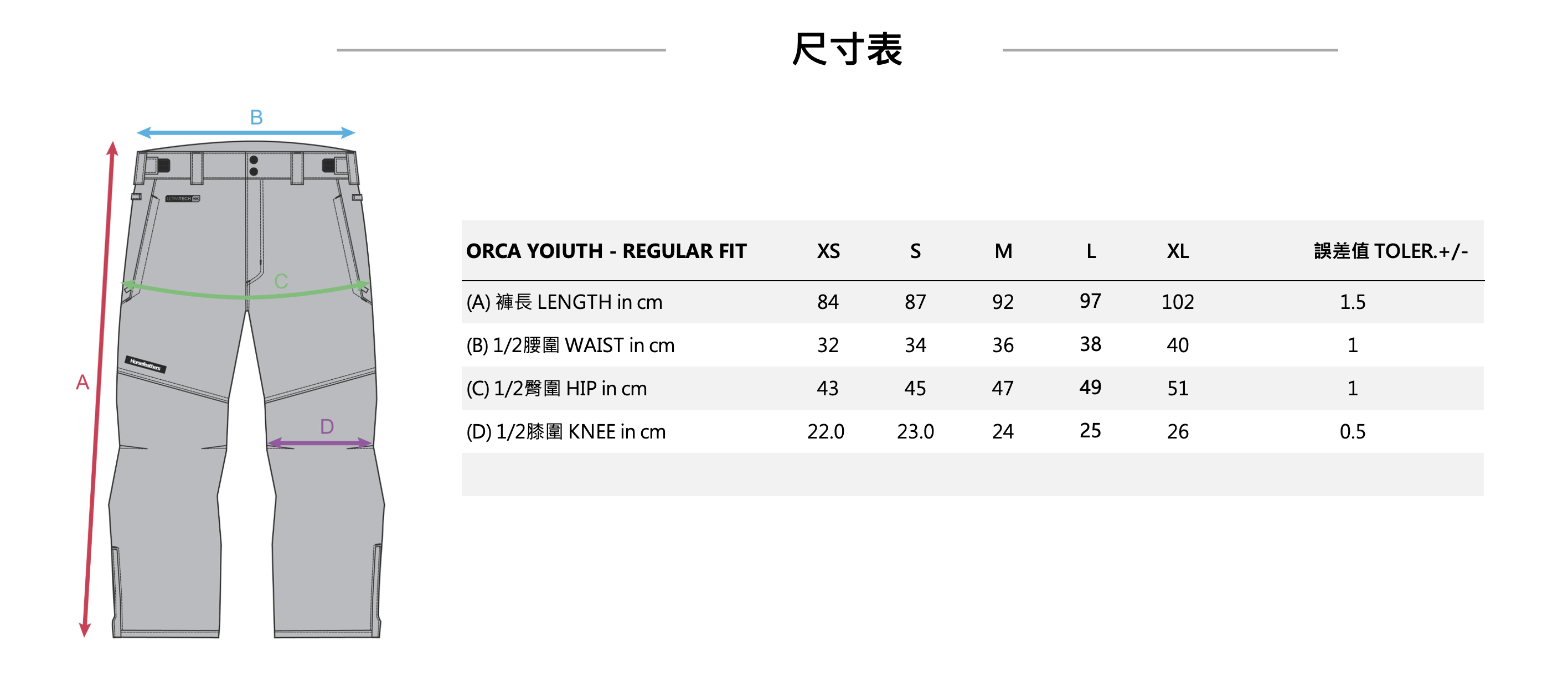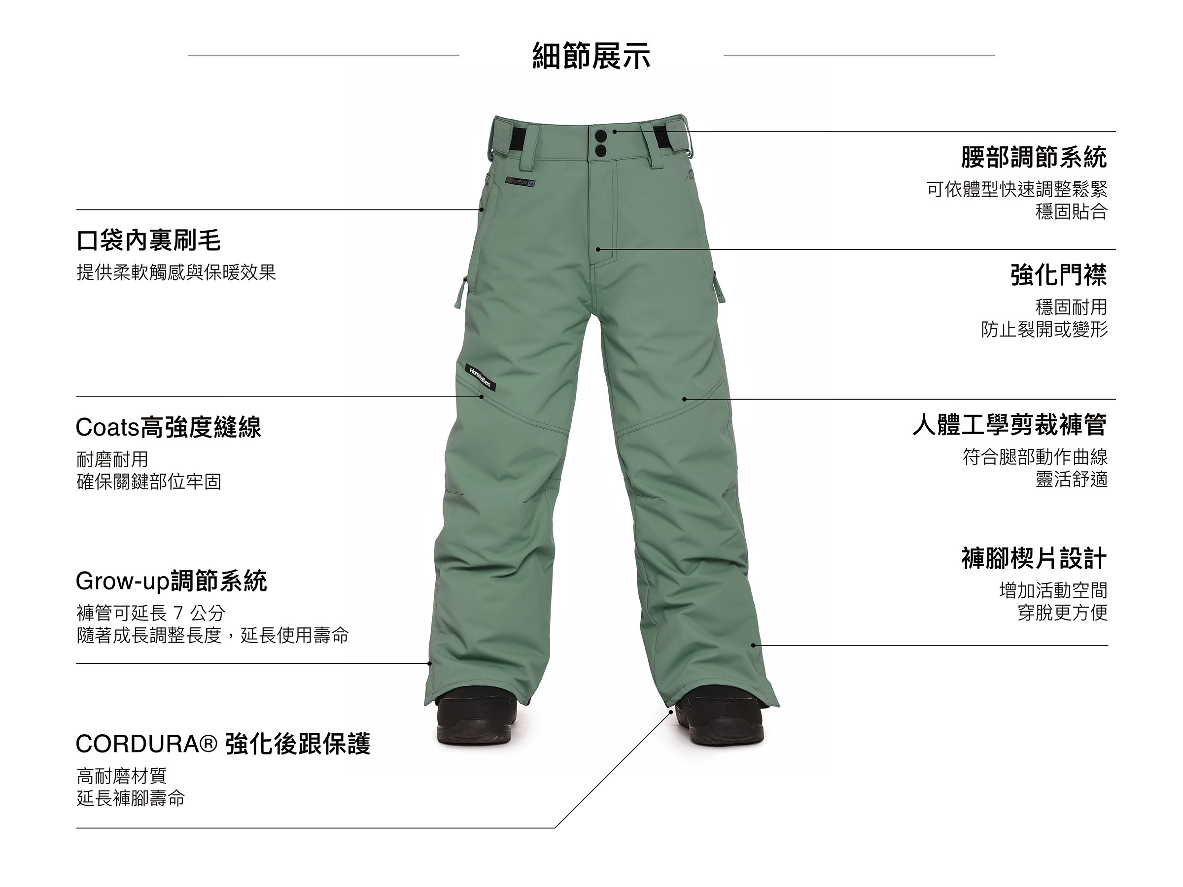 兒童防水透氣滑雪褲(10K/10K)_ORCA YOUTH PANTS,採用與成人款相同的高性能面料,確保孩子 乾爽、保暖、舒適。獨家 “成長”功能 可將褲長縮短最多 7 公分,明年再延長,操作簡單方便。想找頂級青少年滑雪褲?ORCA YOUTH PANTS 是最佳選擇!