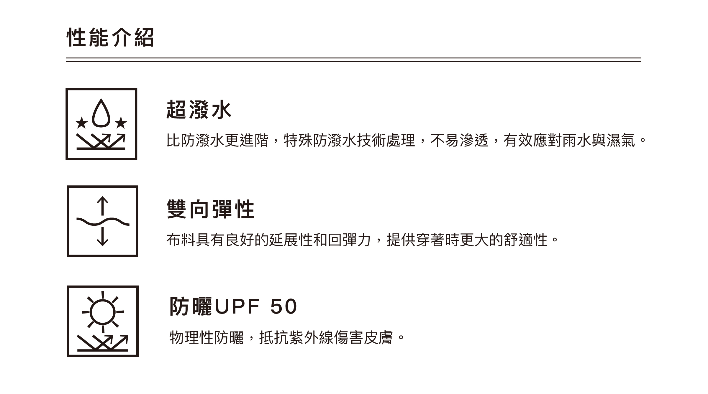 -具備UPF50 防曬、超潑水與雙向彈性機能,日常通勤或假日活動都能輕鬆應對,穿著自在又有保護力