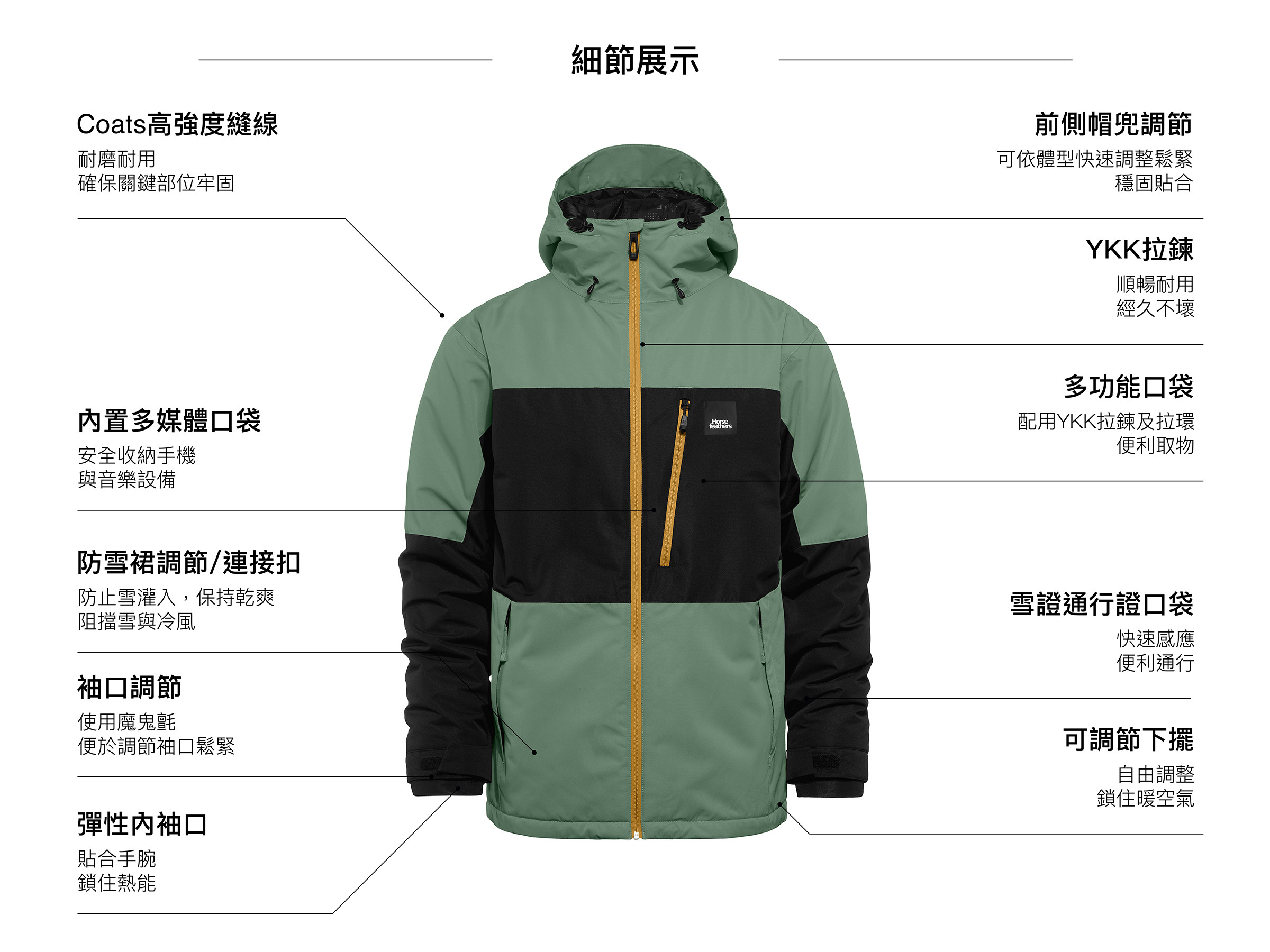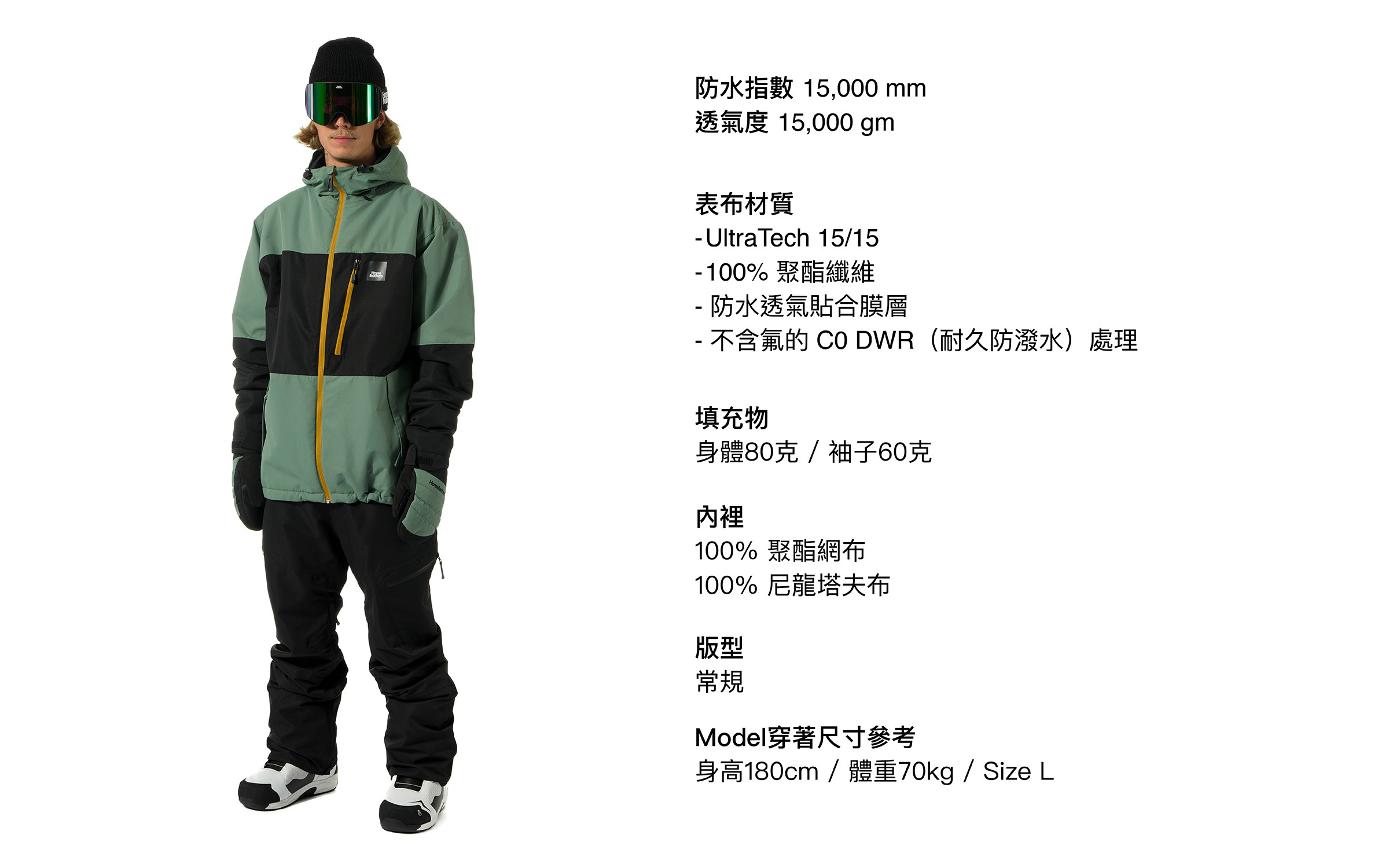 • 不含氟的 C0 DWR(耐久防潑水)處理
