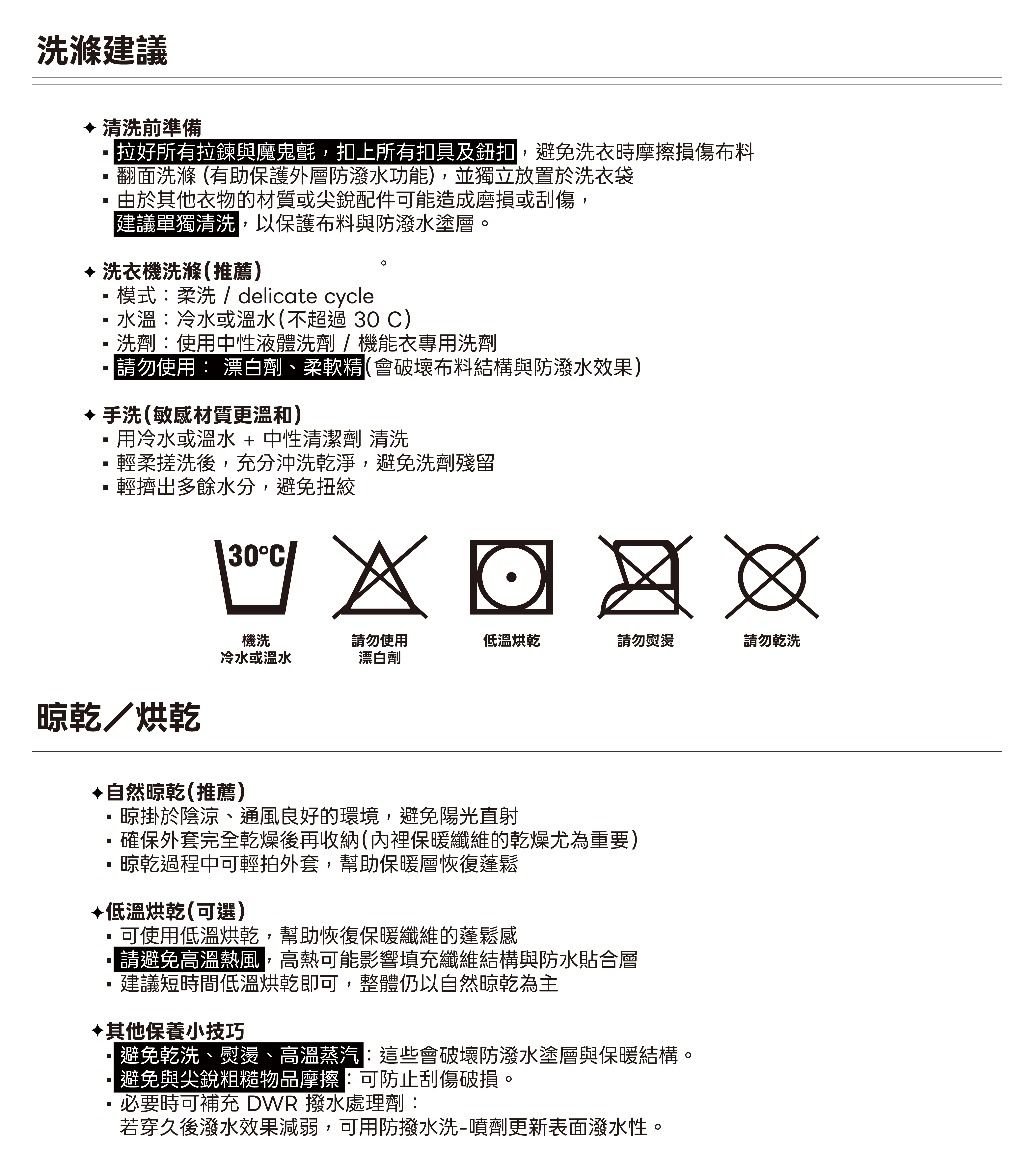 • 不含氟的 C0 DWR(耐久防潑水)處理